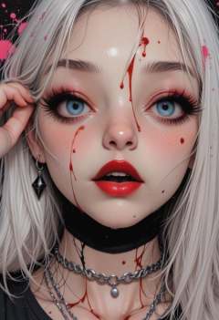 1girl, detailed eyes, (pretty face), (detailed face), (slender, lean, fit, athletic:2), rating_explicit, rating_nsfw, (sexy), defined midriff, skindentations, medium breasts, (perfect body:2), photo-realistic, realistic skin, realistic textures, detailed skin, photorealistic, ultrarealistic, 8k, impossible clothing, hypersexualized, mature themes, inappropriate content, vulgar, obscene, nsfw, explicit, ***** content, erotic, suggestive, intimate, provocative, A close-up, comic book style illustration of a woman with pale skin and long, white hair. her blue eyes are looking directly at the viewer, and she has a serious expression. her lips are slightly parted, revealing a hint of red lipstick. she is wearing a black choker and a silver chain necklace, and her hair is styled in a messy, yet striking manner. the background is dark, with a few splatters of blood on her face, adding to the dramatic effect of the image. the style is reminiscent of comic book art, with bold lines and vibrant colors that bring out the character's intense gaze. 1girl, solo, blue eyes, blood, blood on face, red lips, portrait, white hair, looking at viewer, long hair, rating:general, parted lips, makeup, necklace, jewelry, lipstick, open mouth, score_9, score_8_up, score_7_up, <lora:Sinozick_style:0.8> Sinozick_illu,gradient,spot color, <lora:r-hrtdrp:.5>, <lora:DetailerILv2:.5>, Jeddtl02