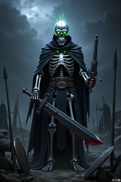 In a dark fantasy style, a skeleton warrior wearing a black battle robe stands on the ruins of the ancient battlefield. His skeleton was filled with a cold blue light, and strange green flames were burning in his hollow eyes. The black battle robe roared in the wind, with broken edges and shining with mysterious runes. In his hand, he held a huge black sword with cracks on his sword body but still emitting evil power. The blade was filled with dark red liquid, as if solidified blood was frozen. Around it was filled with black smoke, and broken shields and broken spears were vaguely visible, creating a gloomy and tragic atmosphere. ,Skeleton Warrior,masterpiece