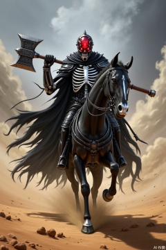A majestic shot of a skeletal warrior galloping across the desert, surrounded by swirling sand and dust. The warrior's imposing figure is clad in black armor adorned with a crimson gemstone-encrusted helmet, radiating an intense, malevolent glow. His dark cloak billows in the wind, revealing a necklace of human vertebrae between his ribs. He wields a massive warhammer with wolf-toothed handle, inscribed with wicked incantations, as he readies to charge into the unknown, exuding fearlessness and ferocity.