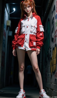 "Evangelion" Asuka, a live cosplay photo, she is wearing a shabby red and white color-blocking functional-style jacket (wear, tear texture in details), with multiple pockets and red fasteners on the jacket to add to the trend. Paired with white sneakers, the sides are decorated with red details, and the overall shape is full of street style, showing off your personality and long legs. The expression is a bit cool, the eyes are drooping, and the casual and unruly temperament is revealed. Her right hand sags naturally, her left hand slim and her posture is loose and confident. It uses a slightly lower angle lens on the front to highlight the body lines and style of dressing. The background is a quiet street, looking down at the camera, slightly curling the corners of lips, the background is an alley full of graffiti and small advertisements, dim, looking down at the camera, the royal sister, delicate and shiny hair, standing, big boobs. Shooting at low angle. The skin texture is delicate and real. Accurately portray the texture and details of the clothing. The dark background, the outline of the character is clear and sharp, the 8K ultra-clear picture quality shows the skin details, the dark parts retain rich layers, presenting a blurry scene atmosphere, highlighting the main character. The picture has the highest picture quality, the light and shadow transition naturally, and the color restores the real color. Thick coating. Dark tone. Alternate contrast of light and dark. Low perspective. close up. Dynamic blur. A full impact picture. Fine, skin highlights, stream of consciousness, background texture, ultra-high definition, high quality, high quality, clear picture, advanced light capture technology, professional post-processing optimization, rendering accuracy beyond game engines, real and delicate skin texture, master-level film and television image standards, super realistic, real rendering, real light and shadow