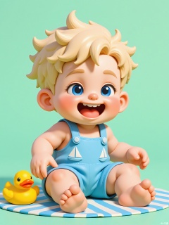 KTXX, 3D CGI illustration of a toddler boy with a mop of curly blond hair, dressed in a bright blue romper with white sailboat appliqués. He has a toothless grin and is clutching a rubber ducky in his left hand. The background is a calming seafoam green. The toddler is sitting on a beach towel, kicking his legs in delight. The style is reminiscent of modern, digital children's illustrations.