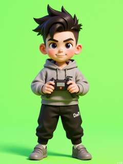 KTXX, 3D CGI illustration of a boy with a swept-back hairstyle, wearing a gray hoodie and black joggers. He has a focused expression and is holding a remote-controlled car, revving the engine. The background is a bright, neon green color. The boy is standing on a smooth surface, ready to race the car. The style is reminiscent of modern, digital children's illustrations.