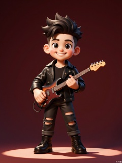 KTXX, 3D CGI illustration of a boy with a quiff hairstyle, wearing a black leather jacket and ripped jeans. He has a confident smirk and is holding a guitar, strumming a chord. The background is a deep, burgundy color. The boy is standing on a stage, ready to perform. The style is reminiscent of modern, digital children's illustrations.