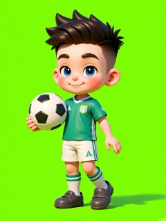 KTXX, 3D CGI illustration of a boy with a crew cut, wearing a soccer jersey and shorts. He has a determined look and is holding a soccer ball, about to take a shot. The background is a bright, kelly green color. The boy is standing on a soccer field, surrounded by teammates. The style is reminiscent of modern, digital children's illustrations.