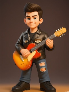 KTXX, 3D CGI illustration of a boy with a quiff hairstyle, wearing a black leather jacket and ripped jeans. He has a confident smirk and is holding a guitar, strumming a chord. The background is a deep, burgundy color. The boy is standing on a stage, ready to perform. The style is reminiscent of modern, digital children's illustrations.