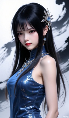 1girl, solo, long hair, bangs, black hair, hair ornament, dress, bare shoulders, jewelry, upper body, earrings, sleeveless, necklace, black eyes, lips, makeup, sleeveless dress, blue dress, lipstick, gem, red lips,ink background