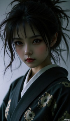 Dark hazy tone, faint light color fading, hazy, focus blur, close-up, a lively pure Ayaha beautiful girl's fuzzy portrait, kimono, messy beauty, high appearance, retro, blur, low saturation, reflection, texture, flood blur, high noise, film grain texture, minimalist style, grayscale aesthetics, freehand, avant-garde visual art aesthetics, high-end sense, masterpiece,
