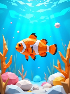 DBX, a digital illustration of a clownfish, depicts a lively coral reef scene in bright cerulean. The clownfish is crafted with geometric polygon patterns, boasting bold orange and white stripes and a small, energetic body. The background is a plain cerulean shade, highlighting the clownfish's vibrant colors. Centered in the picture, the clownfish swims among stylized coral, adding to the underwater vibrancy. This illustration has a modern, cheerful aesthetic with clean lines and a lively palette.