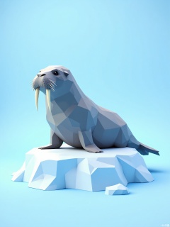 DBX, a digital illustration of a walrus, presents an icy Arctic underwater view in pale blue. The walrus is rendered with geometric polygon patterns, featuring a thick, gray body and long, curved tusks. The background is a simple pale blue hue, emphasizing the walrus's Arctic habitat. Positioned centrally, the walrus lounges on a stylized ice floe, surrounded by an air of cold tranquility. This illustration has a contemporary, majestic feel with clean lines and a cool, icy palette.