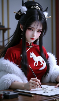 Chinese aesthetics, Chinese style illustrations, brushstrokes, texture, royal sister, princess cut, long straight hair, long flowing hair, Chinese style outfit, red cheongsam, white fox embroidered on the cheongsam, white plush overly, white face and red lips, exquisite, gangster lady style, heroine, gorgeous and elegant, exquisite hairpin, evil, cold, lazy, be aesthetics, black hair, 3D real-person modeling, writing brush words at the desk