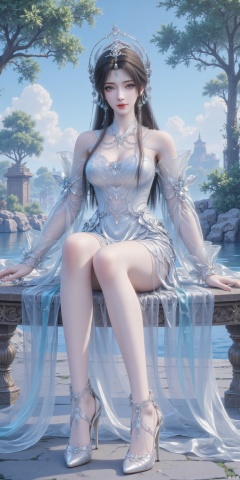 Ultra clear, wallpaper, 8k, sitting,masterpiece, masterpiece,best quality,high quality,,chromatic_aberration,Hair accessories,tree,blue sky ,river,Super long legs,stone,white shirt , ,High heeled sandals,earring,black hair,Light Blue Theme,long legs ,thin legs (masterpiece,wallpaper,best quality:2),1girl,full body,hanfu,full_shot,wallpaper,full body,beautiful legs,seductive_smile,socks_removed, looking_at_viewer,dumpling_Hug_Pillow,cleavage,huge Breasts,embossed high heels,plns_high heels,huaxiangr,magnificent,embossed high heels