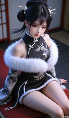 1girl,solo,breasts,looking at viewer,bangs,black hair,hair ornament,dress,sitting,sidelocks,hair bun,blurry,fur trim,makeup,blurry background,chinese clothes,single hair bun,red lips,hair stick,legs