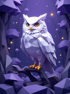DBX, a digital illustration of an owl, portrays a twilight forest scene in deep purple. The owl is crafted with geometric polygon patterns, showcasing fluffy gray-white feathers and piercing yellow eyes. The background is bathed in a smooth gradient of purple, from midnight at the top to a soft lavender at the bottom, evoking a sense of mystery and calm. The owl perches centrally on a stylized branch, its gaze fixed ahead, enhancing the nocturnal ambiance. This illustration has a modern, enigmatic appearance with clean lines and cool, muted tones.