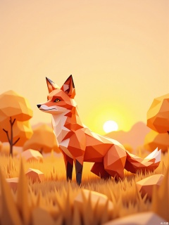 DBX, a digital illustration of a fox, depicts a sunset meadow in warm orange. The fox is designed with geometric polygon patterns, featuring a russet-red coat and a bushy, white-tipped tail. The background is filled with a gradient of orange, blending from a fiery sunset hue at the horizon to a pale peach at the sky's edge, creating a serene and inviting atmosphere. The fox stands proudly in the center, surrounded by stylized grass, exuding a sense of wild elegance. This illustration has a contemporary, rustic feel with simple lines and warm, earthy colors.