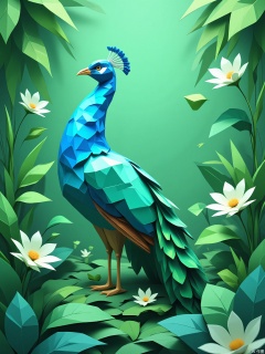 DBX, a digital illustration of a peacock, showcases a lush garden in emerald green. The peacock is rendered with geometric polygon patterns, boasting iridescent blue-green feathers and a striking, fan-shaped tail. The background is a gradient of green, from a deep forest hue at the bottom to a light mint at the top, enhancing the vibrancy of the scene. The peacock struts confidently in the center, its tail on full display, surrounded by stylized flowers and foliage. This illustration has a modern, opulent aesthetic with precise lines and cool, jewel-toned colors.