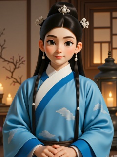 GFRW, A delicate Asian teenager with obsidian tresses in twin braids, azure scholar's robe with cloud motifs, silver hairpin shaped like a lotus, pearl teardrop earrings. Dreamy expression, muted peach-blossom wall backdrop, soft candlelit glow highlighting porcelain skin.