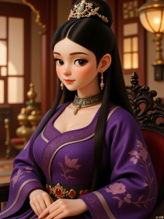 GFRW, A regal woman with raven hair in a phoenix braid, deep purple Tang dynasty gown with peony embroidery, jade hairpin, ruby pendant earrings. Commanding presence, blurred imperial throne background, opulent chandelier light.