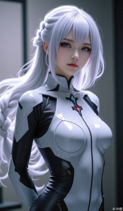 1girl, solo, long hair, breasts, looking at viewer, bangs, (blue eyes), large breasts, very long hair, braid, white hair, parted lips, indoors, hair over one eye, lips, cosplay, single braid, bodysuit, arms behind back, personification, braided ponytail, photo background