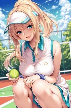 16,1girl,blonde hair,tennis ball,solo,blue eyes,long hair,breasts,visor cap,open mouth,outdoors,ponytail,ball,smile,blush,large breasts,squatting,holding,bare shoulders,sportswear,day,looking at viewer,tennis uniform,sleeveless,sidelocks,skirt,sky,shirt,sleeveless shirt,wristband,blurry,