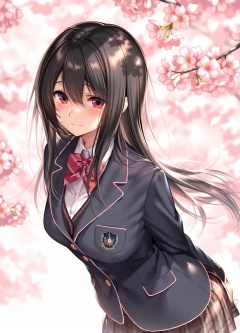 16,1girl, solo, long hair, school uniform, looking at viewer, black hair, blush, bow, jacket, arms behind back, blazer, skirt, red eyes, plaid, plaid skirt, shirt, bowtie, upper body, leaning forward, closed mouth, white shirt, breasts, black jacket, collared shirt, hair between eyes, red bow, smile,Outdoor, cherry blossom trees