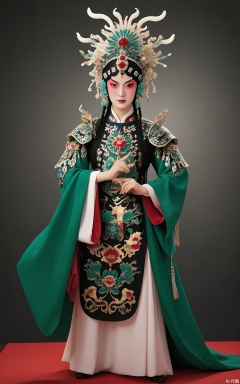 JJRX, A fierce warrior character in Peking Opera dress, dark background. Feathered headdress with emerald stones, bold black-and-gold facial makeup, armor-inspired red robe with lion motifs, jade armlets. Dynamic pose, sharp lighting highlighting metallic accents.
