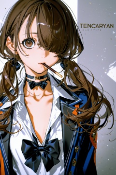(choco (chocolate shop):0.5),(yoneyama mai:0.5),tencarcyan_old_type1,1girl,solo,long hair,shirt,brown hair,long sleeves,bow,jewelry,twintails,brown eyes,jacket,collarbone,white shirt,upper body,food,collared shirt,choker,bowtie,hair over one eye,black choker,low twintails,mouth hold,pocky,food in mouth,loose bowtie,closed mouth,masterpiece,best quality,good quality,low brightness,