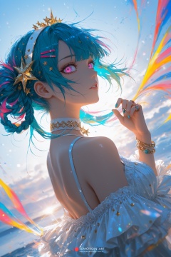 masterpiece,best quality,amazing quality,very aesthetic,absurdres,newest,highres,1girl,solo,long hair,looking at viewer,bangs,hair ornament,jewelry,purple eyes,braid,twintails,multicolored hair,choker,hairclip,pink eyes,off shoulder,star \(symbol\),nail polish,bracelet,aqua hair,ring,hair rings,star hair ornament,short hair,bangs,hair ornament,dress,bare shoulders,upper body,hairband,parted lips,looking back,hair bun,official alternate costume,backlighting,blue and white theme,depth of field,cinematic lighting,light particles,lens flare,(artist:quasarcake:0.8),extreme aesthetic,(wlop:0.6),masterpiece,best quality,good quality,newest,year 2024,year 2023,very aesthetic,absurdres,Visual impact,A shot with tension,ultra-high resolution,32K UHD,sharp focus,best-quality,masterpiece,Emotionalization,unconventional supreme masterpiece,masterful details,temperate atmosphere,with a high-end texture,in the style of fashion photography,(Visual impact:1.2),giving the poster a dynamic and visually striking appearance,impactful picture,offcial art,colorful,splash of color,movie perspective,