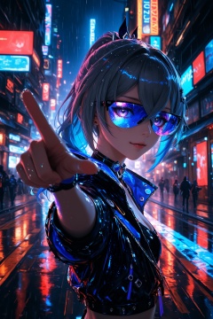 masterpiece,best quality,amazing quality,very aesthetic,absurdres,newest,highres,nixeu:0.5,yoneyama mai:0.5,1girl,solo,silver wolf \(honkai: star rail\),honkai \(series\),cyberpunk,street,night,darkness,metallic texture,from side,ray tracing,pointing to you,rain drops on the girl,strong color performance,oil painting style,