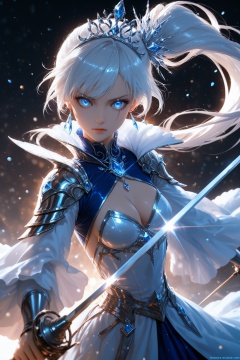 masterpiece,best quality,amazing quality,very aesthetic,absurdres,newest,extreme aesthetic,in the style of fashion photography,light particles,cinematic lighting,Visual impact,sharp focus,Emotionalization,depth of field,dutch angle,scenery,weiss_schnee,1girl,solo,long_hair,breasts,looking_at_viewer,bangs,blue_eyes,hair_ornament,long_sleeves,dress,holding,cleavage,jewelry,medium_breasts,closed_mouth,upper_body,ponytail,weapon,white_hair,earrings,small_breasts,shiny,sword,artist_name,signature,wide_sleeves,necklace,holding_weapon,white_dress,armor,blurry,shiny_hair,side_ponytail,lips,v-shaped_eyebrows,clothing_cutout,eyelashes,floating_hair,blue_dress,glowing,watermark,scar,holding_sword,cleavage_cutout,tiara,shoulder_armor,gem,glowing_eyes,web_address,light_particles,scar_on_face,pendant,backlighting,dual_wielding,high_collar,serious,glint,scar_across_eye,shrug_\(clothing\),blue_gemstone,rapier,left-handed,