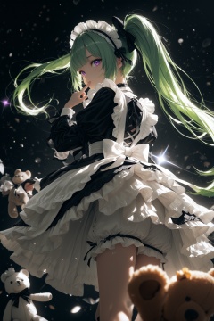 masterpiece,best quality,amazing quality,very aesthetic,absurdres,newest,in the style of fashion photography,light particles,cinematic lighting,Visual impact,sharp focus,Emotionalization,depth of field,dynamic pose,dutch angle,extreme aesthetic,scenery, 1girl, solo, long hair, dress, twintails, underwear, purple eyes, green hair, looking back, virtual youtuber, maid headdress, stuffed toy, stuffed animal, black background, finger to mouth, lolita fashion, teddy bear, bloomers, gothic lolita
