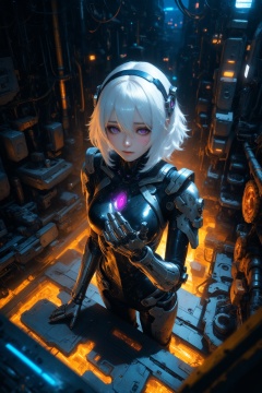 masterpiece,best quality,amazing quality,very aesthetic,absurdres,newest,highres,game cg,realisti,Cyberpunk,girl wearing science fiction clothes,cyborg girl,gear,hollowed out body various mechanical structures,complex mechanical structures,dim repair shop,repair cyborg girl,empty eyes,scratches,damage,cracks,from_above,unreal engine,surreal,armor,1girl,solo,looking at viewer,medium hair,bangs,hairband,purple eyes,hair ornament,hair between eyes,white hair,fluffy hair,blush shy,shiny_skin,very detailed clothes,very realistic textures,very detailed textures,longeyelashes,brown eye shadow,night,dim light,cyberpunk,mechanical arm,sci-fi style clothes,hair_tucking,metal material,realistic metallic texture,raise your hand,