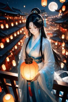 masterpiece,best quality,amazing quality,very aesthetic,absurdres,newest,1girl, solo, hanfu, long hair, black hair, long sleeves, hair ornament, dress, holding, closed mouth, jewelry, outdoors, earrings, wide sleeves, hair bun, blurry, blurry background, night, chinese clothes, see-through,facial mark, looking down, moon, tassel, night sky, light particles, full moon, lantern, forehead mark, railing, architecture, east asian architecture, paper lantern, holding lantern,happy, Bright Festive Holiday Lights Lighting, from_above,