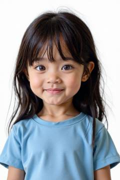 film grain, 1y.o. baby, solo, realistic, black hair, looking at viewer, blue t-shirt, long hair, smile, brown eyes, closed mouth, photorealistic, upper body, white background, simple background,