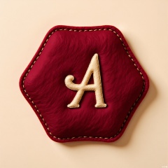 MZTB, Photograph of a pentagonal, burgundy felt emblem with a gold, embroidered initial "A" in a refined, calligraphic style. The emblem has a dense, velvety surface and is outlined with gold thread. The background is a soft, creamy beige. The lighting is warm and inviting, highlighting the emblem's luxurious feel and the intricacy of the stitching. The emblem is centered in the image, with a subtle shadow beneath it, creating a sense of sophistication. The style is simple yet elegant, focusing on the emblem's design and tactile quality.
