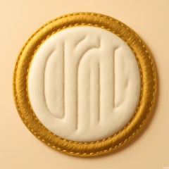 MZTB, Photograph of a pentagonal, burgundy felt emblem with a gold, embroidered initial "A" in a refined, calligraphic style. The emblem has a dense, velvety surface and is outlined with gold thread. The background is a soft, creamy beige. The lighting is warm and inviting, highlighting the emblem's luxurious feel and the intricacy of the stitching. The emblem is centered in the image, with a subtle shadow beneath it, creating a sense of sophistication. The style is simple yet elegant, focusing on the emblem's design and tactile quality.