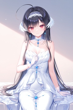 masterpiece,best quality,newest,absurdres,highres,soft shadows,year2024,(chen bin:0.7),(hiten \(hitenkei\):0.4),(rimuu:0.5),(mignon:0.5),(sheya:0.6),<lora:miaXLNAI-000010:1>,mianonomiya,1girl,ahoge,frilled hairband,black hair,long hair,red eyes,light smile,<lora:nightowlXLNAI:1>,nightowl, white dress, long dress, jewelry, hair ornament, elboww gloves,