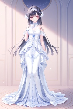 masterpiece,best quality,newest,absurdres,highres,soft shadows,year2024,(chen bin:0.7),(hiten \(hitenkei\):0.4),(rimuu:0.5),(mignon:0.5),(sheya:0.6),<lora:miaXLNAI-000010:1>,mianonomiya,1girl,ahoge,frilled hairband,black hair,long hair,red eyes,light smile,<lora:nightowlXLNAI:1>,nightowl,white dress,long dress,jewelry,hair ornament,elboww gloves,full body,standing,hand on own chest,arm at side,