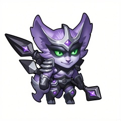 OKJS, A digital illustration of a chibi-style character with short purple hair, green eyes, and fox ears. The character dons a sleek, silver and black futuristic outfit with glowing accents and a small utility belt, holding a staff with a pulsating purple orb at the top. They have a mischievous grin and stand with one foot slightly forward. The background is a pristine white. The style evokes anime and RPG character concepts.