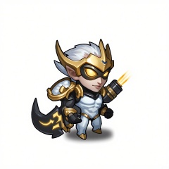 OKJS, A digital illustration of a chibi-style character with short white hair, gold eyes, and a robotic left arm. The character wears a futuristic, white and gold jumpsuit with glowing circuit patterns and a visor over their eyes, holding a high-tech blaster. Their expression is cool and collected. The background is a pristine white. The style is reminiscent of cyberpunk anime and android character concepts.