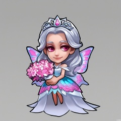 OKJS, A digital illustration of a chibi-style character with long silver hair, pink eyes, and butterfly wings. The character wears an elegant, pastel-colored dress with floral patterns and a delicate tiara, holding a bouquet of blooming flowers. They have a gentle, dreamy smile. The background is a pristine white. The style is reminiscent of fairy tale anime and princess character designs.