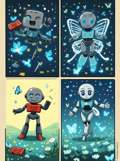 MHCT, Digital drawing in a cute, cartoon style, featuring four panels arranged in a grid. Each panel shows a little robot with a round body and glowing blue eyes, interacting with a butterfly. The top left panel shows the robot holding a flower and a toolbox, with a butterfly resting on the flower. The top right panel depicts the robot using a tool to adjust a part on its body, making a soft, melodious sound that attracts more butterflies. The bottom left panel shows the robot dancing with the butterflies, its body spinning and lights flashing. The bottom right panel shows the robot and the butterflies flying together over a beautiful meadow.