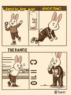 MHCT, Digital drawing in a cute, cartoon style, featuring four panels arranged in a grid. Each panel shows a young athlete with a tracksuit and sneakers, interacting with a rabbit. The top left panel shows the athlete holding a stopwatch and a water bottle, with a rabbit hopping nearby. The top right panel depicts the athlete and the rabbit racing on a track, the rabbit leading the way. The bottom left panel shows the athlete and the rabbit crossing the finish line together, the rabbit jumping for joy. The bottom right panel shows the athlete and the rabbit celebrating with a high-five, both out of breath but smiling.