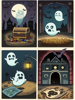 MHCT, Digital drawing in a cute, cartoon style, featuring four panels arranged in a grid. Each panel shows a little ghost with a transparent body and glowing eyes, interacting with a bat. The top left panel shows the ghost holding a lantern and a map, with a bat hanging upside down nearby. The top right panel depicts the ghost floating through a haunted house, the bat following it. The bottom left panel shows the ghost and the bat discovering a hidden treasure chest, the bat pointing at it excitedly. The bottom right panel shows the ghost and the bat sharing the treasure, which turns out to be a pile of candy.