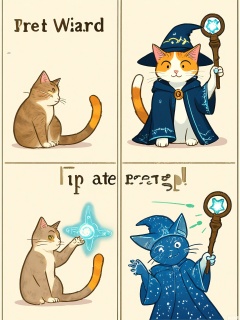 MHCT, Digital drawing in a cute, cartoon style, featuring four panels arranged in a grid. Each panel shows a young wizard with a pointy hat and a long, blue robe, interacting with a cat. The top left panel shows the wizard holding a wand and a spellbook, with a cat sitting nearby. The top right panel depicts the wizard waving the wand and chanting a spell, making the cat's fur turn rainbow-colored. The bottom left panel shows the wizard and the cat looking at each other in surprise, then breaking into laughter. The bottom right panel shows the wizard and the cat walking through a magical forest, the cat's rainbow fur glowing.