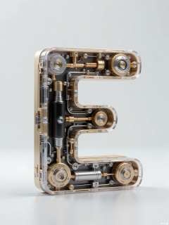 JXZT, A highly detailed, futuristic, and abstract sculpture made from transparent and metallic materials, forming the letter "E" in a highly stylized way. The sculpture is made up of overlapping layers of transparent panels and metallic frames, with small LED lights embedded within, casting a soft glow. The design combines organic curves with sharp, mechanical lines, creating a sense of harmony between nature and technology. The plain grey background allows the sculpture's intricate details to shine through.