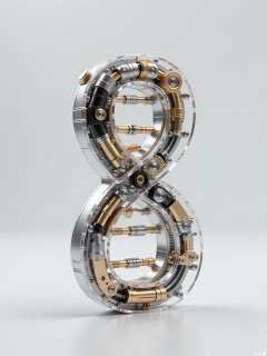 JXZT, A highly detailed, futuristic, and abstract sculpture made from transparent and metallic materials, shaped like a DNA double helix. The double helix is made from a combination of transparent tubes and metallic rods, with small mechanical parts connecting the two strands. The lighting highlights the intricate details of the sculpture's structure, emphasizing its scientific and technological significance. The simple grey background provides a neutral backdrop for the sculpture's complex and fascinating design.