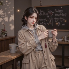 The 24-year-old senior sister wore a smog grey knitted cardigan, an oatmeal hooded sweatshirt on the inside, and khaki ramie-blend high-waisted wide-leg pants on the bottom. The trouser legs were covered with hand-sewn cotton thread tassels. Wear a short beige linen windbreaker on the outside, with a rolled-up cuff showing a tattoo of forearm, and a silver gear waist chain hanging around the waist. The long black hair is tied into a fishbone braid and droops to the collarbone, dark red ribbons are wrapped around the hair, the ear bones are punctured and matte metal frame glasses, and tortoiseshell thin chain glasses are mounted on the bridge of the nose. She leaned against the wooden bar in the campus cafe. The warm light penetrated the latte lacquer milk bubbles and cut a fine grating on the surface of the ramie fabric. The 3D rendering perfectly presents the knitted fluffy texture and the natural folds of linen. The mug tapped with her fingertips reflected the shadow of the sycamore tree by the window along the condensed water droplets, and the pupils showed amber star gradient. The blackboard handwritten formula with a blurred background was intertwined with suspended chalk gray light particles.