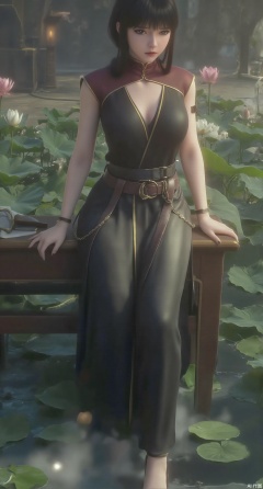 (masterpiece:1.2),best quality,The image is a digital illustration of a young woman sitting on a wooden bench in a pond with lily pads. She is wearing a long dress with design on the chest and sleeves. The dress has a high neckline and short sleeves,Holding a lotus in hand. She has long dark hair styled in loose waves and is wearing gold high heels. The woman is posing with one hand on her hip and the other resting on the edge of the bench. The background is filled with pink and white lotus flowers and green leaves. The overall mood of the image is peaceful and serene,(huge breasts:2.99),(full breasts:2.99),(Background with traditional Chinese architecture,Pond, water lilies:1.39),,XzilingXY3,XlimuwanJCY,XmoxianYK,Xfanlv
