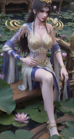 (masterpiece:1.2),best quality,The image is a digital illustration of a young woman sitting on a wooden bench in a pond with lily pads. She is wearing a long dress with design on the chest and sleeves. The dress has a high neckline and short sleeves,Holding a lotus in hand. She has long dark hair styled in loose waves and is wearing gold high heels. The woman is posing with one hand on her hip and the other resting on the edge of the bench. The background is filled with pink and white lotus flowers and green leaves. The overall mood of the image is peaceful and serene,(huge breasts:2.99),(full breasts:2.99),(Background with traditional Chinese architecture,Pond, water lilies:1.39),,XzilingXY3,XlimuwanJCY,XmoxianYK,Xfanlv