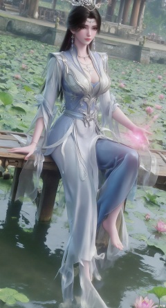 (masterpiece:1.2),best quality,The image is a digital illustration of a young woman sitting on a wooden bench in a pond with lily pads. She is wearing a long dress with design on the chest and sleeves. The dress has a high neckline and short sleeves,Holding a lotus in hand. She has long dark hair styled in loose waves and is wearing gold high heels. The woman is posing with one hand on her hip and the other resting on the edge of the bench. The background is filled with pink and white lotus flowers and green leaves. The overall mood of the image is peaceful and serene,(huge breasts:2.99),(full breasts:2.99),(Background with traditional Chinese architecture,Pond, water lilies:1.39),,XzilingXY3,XlimuwanJCY,XmoxianYK,Xfanlv